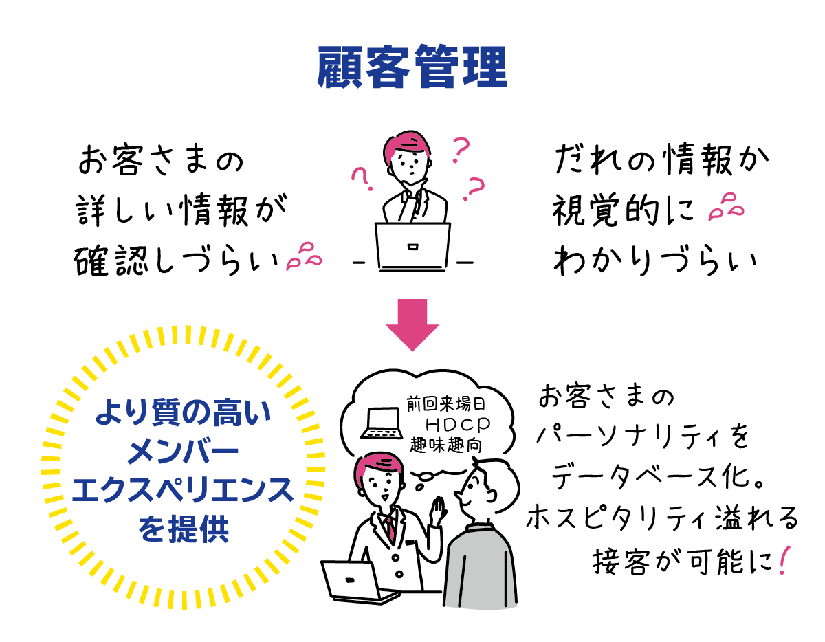 電話の接客、お問合せ、スタート、精算と業務ノウハウを集約し、ブラウザ操作で直感的な画面遷移がパーソナライズされてメンバーエクスペリエンスを演出するシームレスできめ細やかな接客をサポートします。
